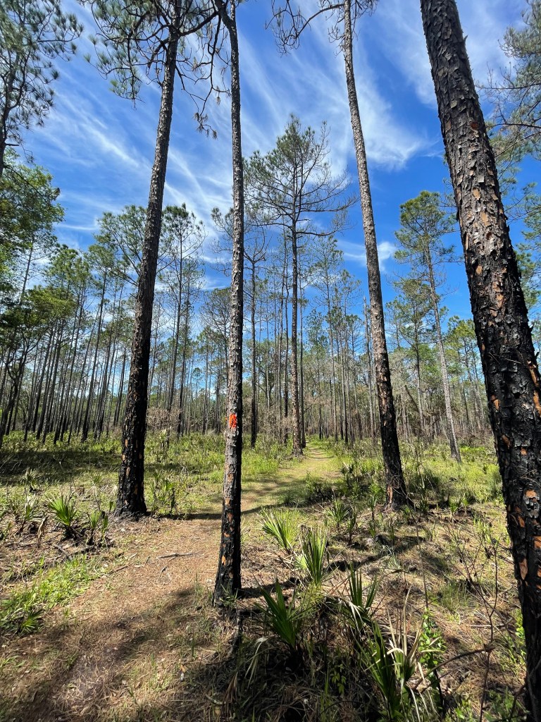 Just one half-mile north of the High Bluff campsite is the point where the Florida Trail enters the Richloam Tract of the Withlacoochee Forest, and the nearest next trailhead is by way of a 0.7 mile connector trail that connects with the Florida Trail 5.9 miles north of the High Bluff campsite. Although that connector trail meets a convenient parking lot next to the historic Richloam General Store (a restored general store that sells tasty ice cream and bottled sodas), Richloam recently suffered extensive hurricane damage. As of the writing of this post (January 4, 2025), the connector trail from the Richloam General Store to the Florida Trail was impassable because of downed trees—I found out the hard way when I recently attempted to reach High Bluff via that connector trail.