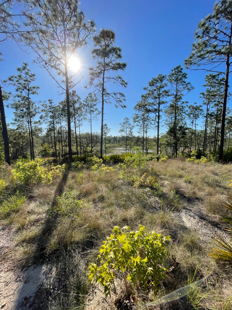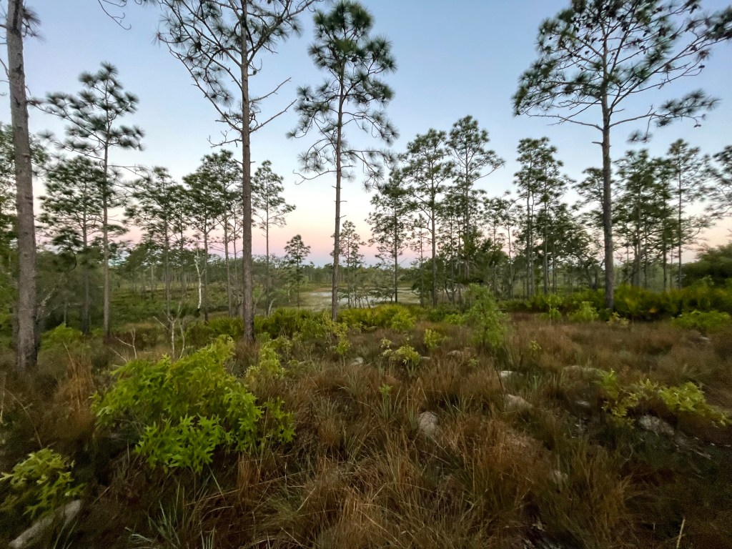 Perhaps my favorite place to camp in the Green Swamp is the Concession Stand campsite, which sits less than a tenth of a mile down the crest of a sandhill sitting beside a pond. The campsite itself is intimate, with places for tents beside majestic longleaf pine or under live oaks. But the crest of the hill is the highlight, where I eat all camp meals and spend dreamy breezy evenings staring at the hundreds of stars visible on clear nights because of its distance from the city lights of Orlando and Tampa. Owls call throughout the night, as do occasional distant packs of coyotes. I’ve camped in the West Tract of the Green Swamp in April, June, and December, and I have yet to be disappointed. (But I do recommend avoiding the Green Swamp between May and the beginning of December because of mosquitoes and spider webs on the trail.)