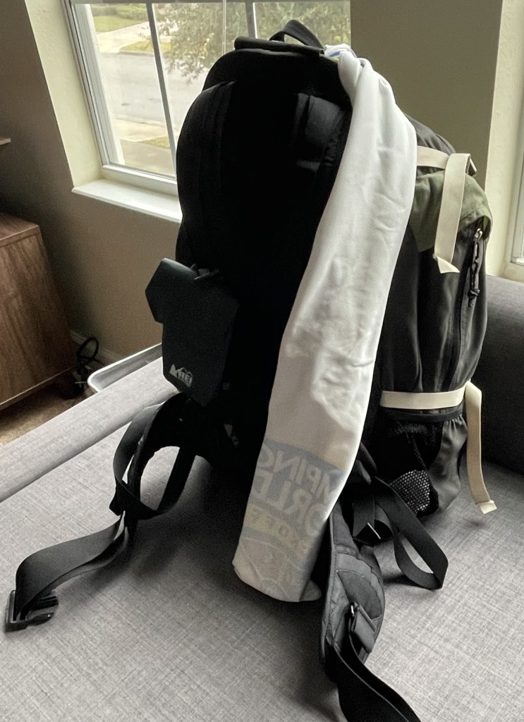 5. Always-Handy Sweat Towel: My name is Rob Rogers, and I am a heavy sweater. And nothing gets older while backpacking than having streams of sweat running into your eyes from beneath the brow of your sweat-soaked hat. So I always strap a towel to the top of backpack that drapes over my left shoulder while I hike with which to wipe my salty brow. Your inner adolescent may be asking, “Why not just use your shirt?” Because after three miles of backpacking, every square centimeter of my shirt is already soaked with sweat. I prefer to use the long skinny towels designed to be immersed in cold water and draped across the shoulders of athletes, as they more easily reach my brow when tied to the top of my pack without forcing me to turn my head. Since I don’t carry an actual camp towel for short trips, le towel de sweat also serves other purposes in camp. Por ejemplo, I’ve used the cleaner length closest to the knot to wipe clean my coffee mug. It’s also been helpful when I’ve encountered sappy firewood on the trail that left sticky-icky on my hands that would not rub off, even with the aid of a few loogies.