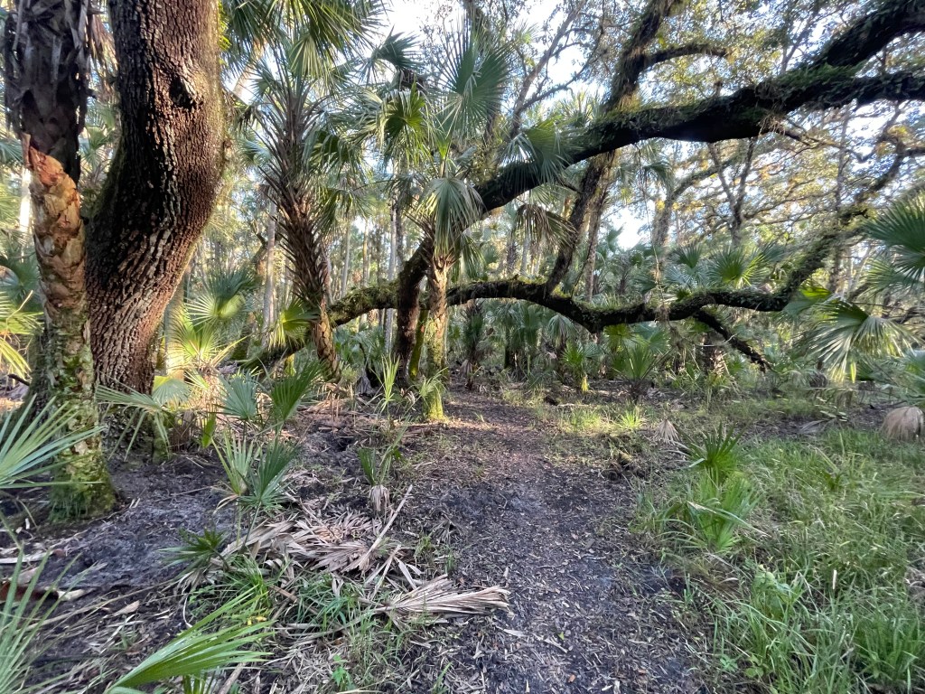 From there I climbed through a palmetto savannah, then into a gorgeous pine savanna, where tall longleaf pines towered over prairie grasses and huge palmettos that often rose above my head. Eventually I met the open sky again in low-rolling sandhills covered by turkey oaks, then reached the last stretch of my hike, where I descended into a dense palm hammock, crossing a pretty bridge at Christmas Creek. My hike ended by winding through a dense forest of cypress, cabbage palm, and palmetto, where the trail surface turned to compact dark mud frequently rooted by hogs.