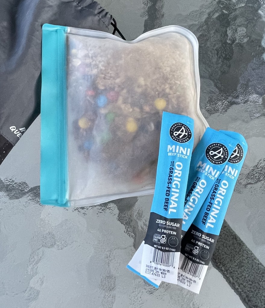 Breakfast: REI also sells boil-in-a-bag breakfast delicacies, but I go with simpler fare: oatmeal. Prepackaged single servings of oatmeal in plenty of flavors can be found at any grocery store, and they are quick and easy to make in the morning and can be eaten cold if it’s raining. (Personally, I prefer to have trail mix instead if I can’t boil water for my oatmeal.) I also like supplementing my oatmeal with a few M&Ms and dried cranberries from my trail mix to add some gooey texture and extra sugar.