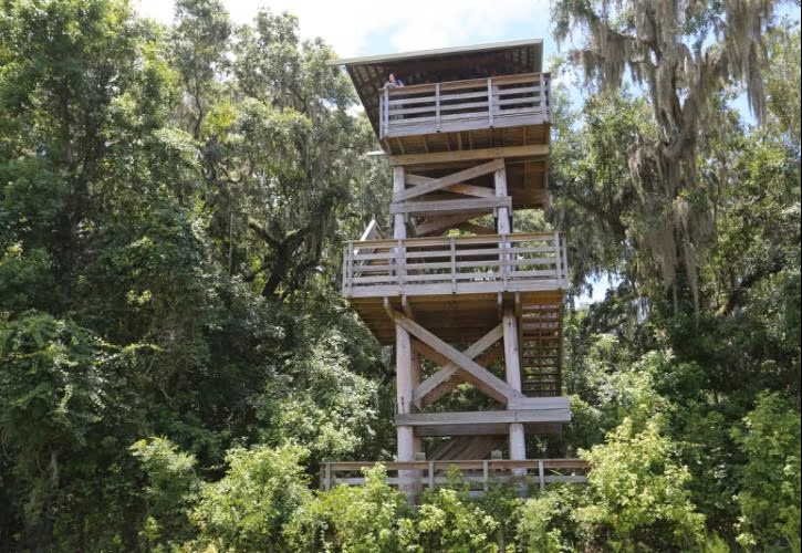 Paynes Prairie is now home to a state park accessible from multiple entry points containing several scenic overlooks and interpretive centers and more than 30 miles of trails. The park’s main entrance off State Road 441 south of Gainesville provides access to the visitors’ center and a 50-foot observation tower, which both sit on a rise overlooking the prairie, as well as the main campground near the eastern shore of Lake Wauberg. (The other side of Lake Wauberg is a recreation area reserved for University of Florida students—I sailed there when I was an undergrad.) The northern section of the state park is more easily accessed southeast of Gainesville and provides access to the 16-mile Gainesville-Hawthorne State Trail, a rails-to-trails route popular with cyclists.