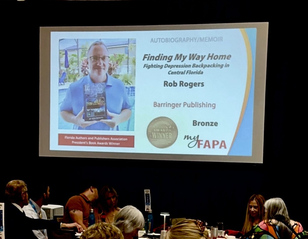 Kara and I had a great time attending the President’s Book Awards dinner on Saturday at FAPACon, the annual conference for the Florida Authors and Publishers Association, where my book, Finding My Way Home: Fighting Depression Backpacking in Central Florida, won the Bronze Medal for Autobiography/Memoir. I also had the privilege of getting to know many of the other award-winning authors–my list of books to read is now substantially longer!