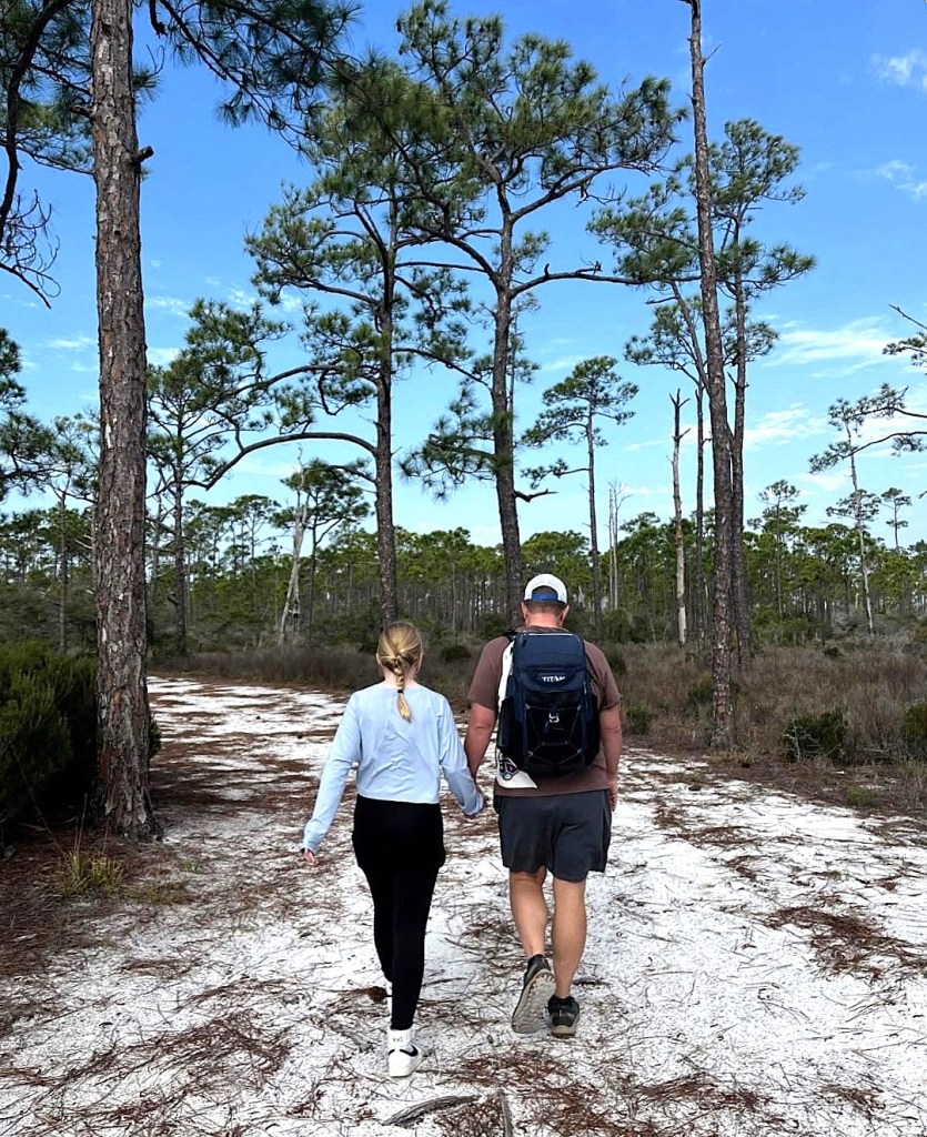 St. George Island State Park is popular with the RV set for its quaint campground nestled among sand dunes and piney flatwoods between pristine natural beaches and the bay, and it’s also popular with both locals and visitors who like to cycle on its miles of unshaded beachside roads. But the Gap Point primitive campsite is the park’s hidden gem, nestled on the southwestern shore of a pine covered bayside peninsula at the end of the 2.5 mile Gap Point Trail. During my family’s spring break trip to a rental home at St. George Island last March, I was cheated out of camping there by weather (or perhaps a hangover), but my girls and I were able to do a morning hike on the Gap Point Trail.
