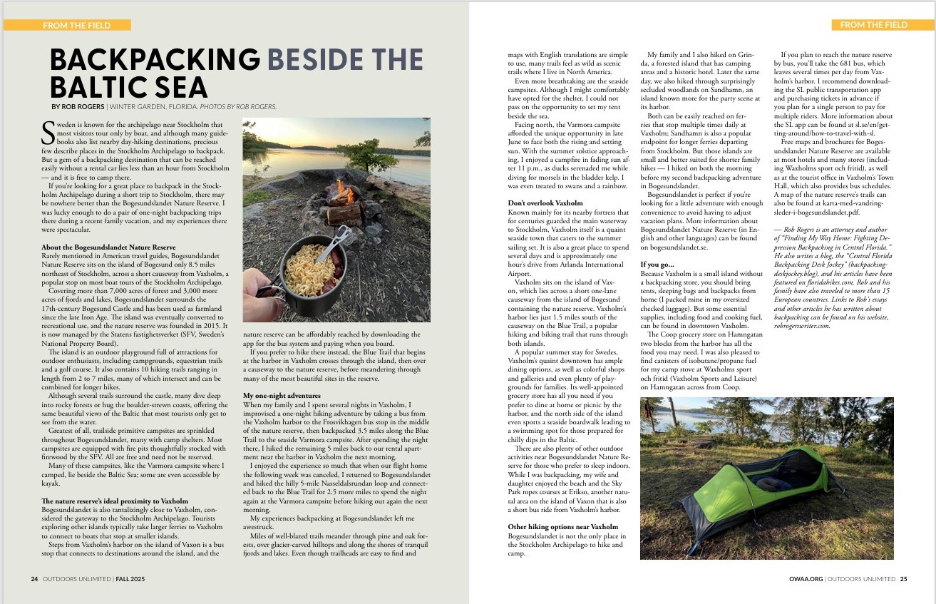 Today’s Fall 2025 issue of Outdoors Unlimited includes my article titled “Backpacking Beside the Baltic Sea,” a travel piece about a great national preserve near Stockholm, Sweden for hiking, camping, and backpacking. Outdoors Unlimited is the official publication of the Outdoor Writers Association of America.