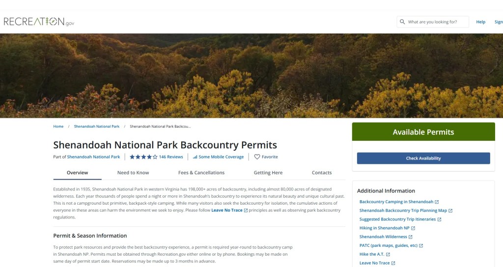 - Pick Your Route Before You Go and Research Reservation Requirements: Although you should always plan a route before backpacking even at home, this goes double when you’re flying to a destination. Print your maps or download them onto your phone before you leave, as you don’t want to count on having phone reception in the backcountry. Consider also googling the altitude and elevation gain on your route to be sure you’re not biting off more than you can chew. Perhaps most importantly, confirm whether you need to book a backcountry campsite at your desired destination before you go. For example, when I went to Shenandoah National Park earlier this month, I had to obtain a backcountry permit for my preferred camping zone before I arrived. This was in addition to paying the park’s entrance fee, and I had to print my backcountry permit at home before I left. Also check hunt dates, so you know whether you’ll need to avoid hunters or wear orange.