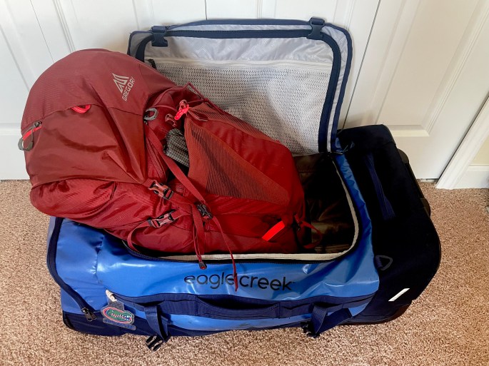 - Consider Purchasing a Large Roller Duffel Bag: The key purchase that allowed me to begin backpacking on family vacations is a wheeled duffel bag big enough to fit the backpack and gear I take on the trail. I suppose you could simply check your backpack separately at the airport, then pack your other clothes and items in your carry-on or a second checked bag, but I find it easier to just travel with a large (120 liter) rolling duffel. I’m referring here to a rolling bag with a single open compartment big enough to fit a loaded backcountry pack and additional clothes, shoes, coats, and toiletries for the remainder of the time you plan to spend in civilization.