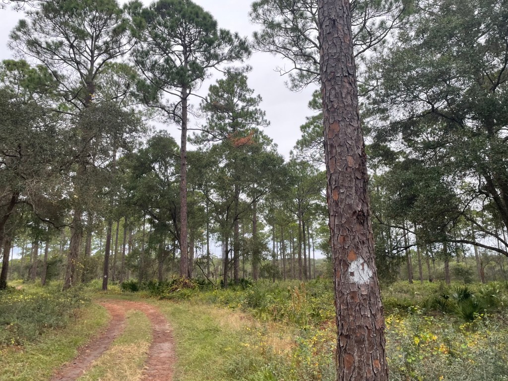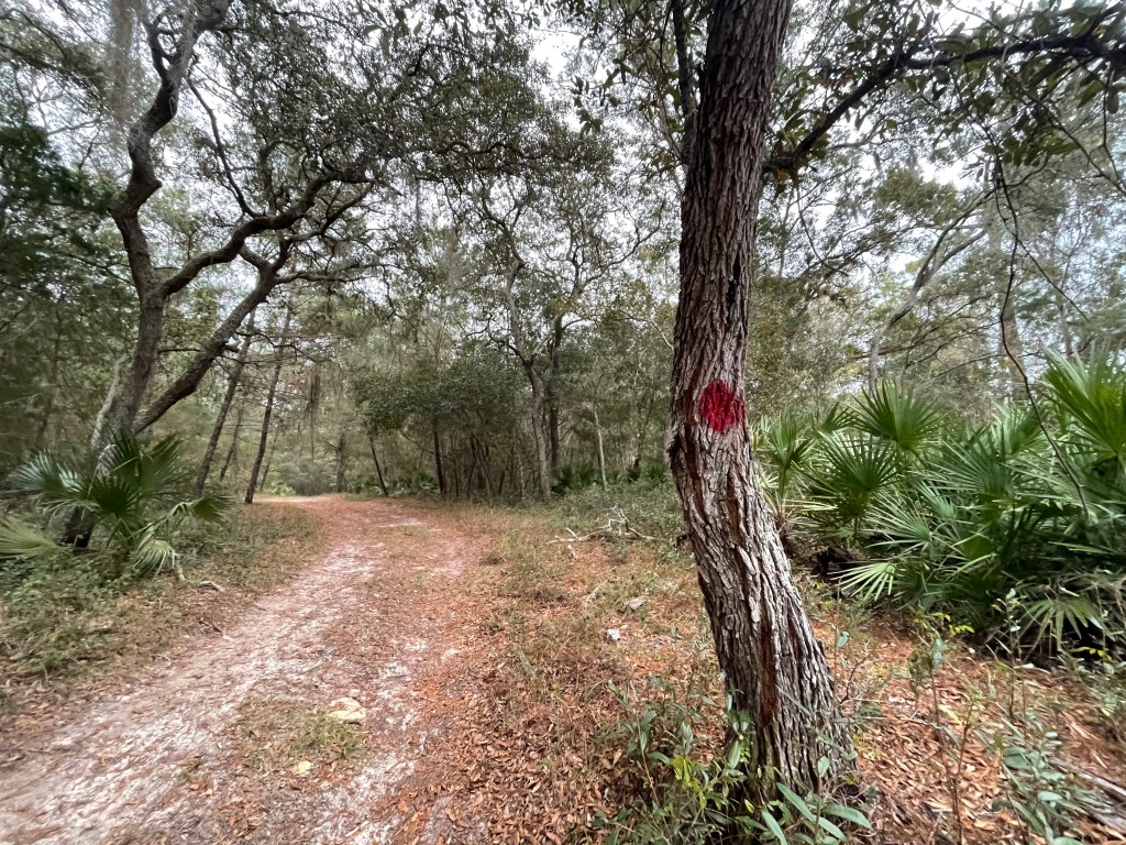 The family-friendly trails also offer a surprising variety of terrain for a tract of its size. Within four miles of setting off from either trailhead, you’ll pass through messic flatwoods, scrub and scrubby pine flatwoods, and sandhills, and even cross a few creeks on sturdy bridges. Although the trails remain almost entirely along wide jeep tracks with a fair amount of soft sugar sand (including a nearly mile-long stretch of the Red Trail beneath a powerline), the tradeoff is the frequency and visibility of blazes that simplify navigation. Even after dark, it’s easy to find your way along these trails with little risk of getting lost.