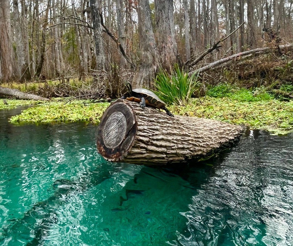 Although Ichetucknee Springs draws massive crowds in the summer, for my money, the time to visit is the winter when you can enjoy the springs in peace and tranquility. By renting our kayaks shortly after the General Store opened around 9 a.m., we were able to have the river largely to ourselves and were spared from the boisterous crowd noise that is surely inescapable in summer months. Herons, egrets, and tons of turtles watched us drift by, and several hawks perched on branches hanging over the river.