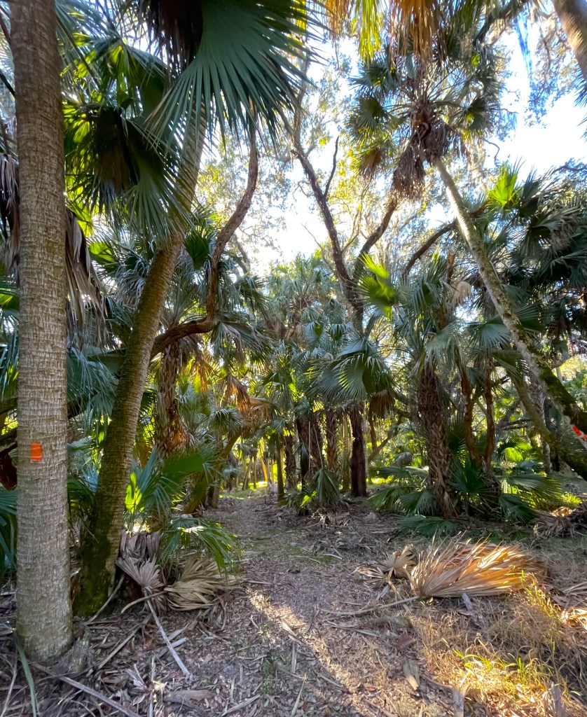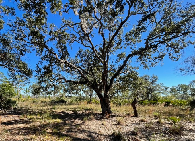 What makes Prairie Lakes so enjoyable is the variety of terrain, the wildlife, and the tranquility at night. The North Loop splits its distance between pine flatwoods, those open spaces covered by low palmettos and occasional tall pines, and shaded oak hammocks, with live oaks sprouting above the forest floor like giant fern and moss-cloaked fingers. Although the South Loop stays primarily in hammocks, it contains more palm hammocks with towering palm trees jostling the trail from side-to-side. Most of the trail on both loops also borders the broad dry prairie, which the Dry Pond campsite sits beside.