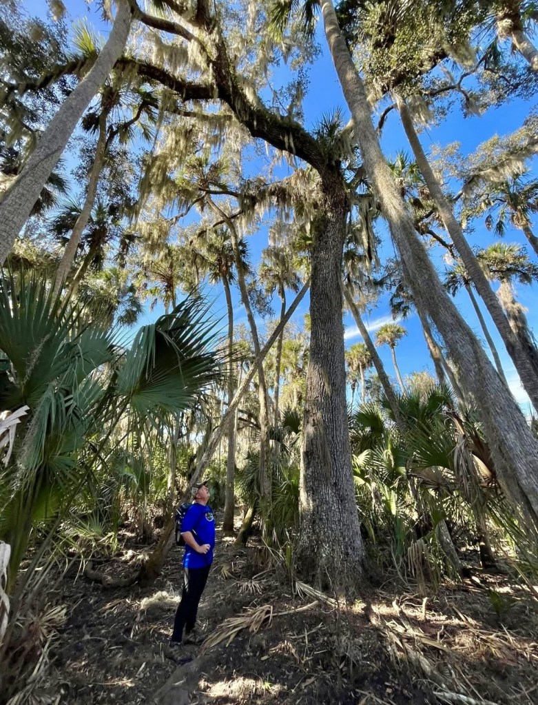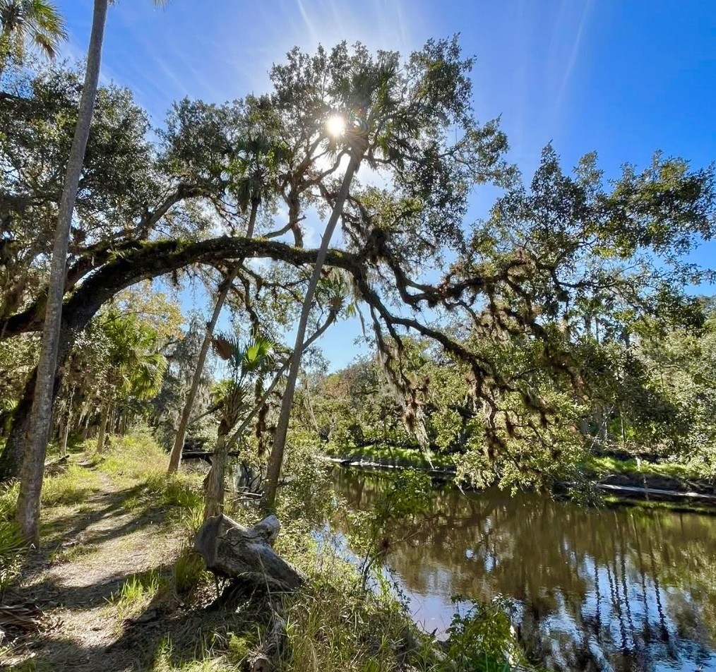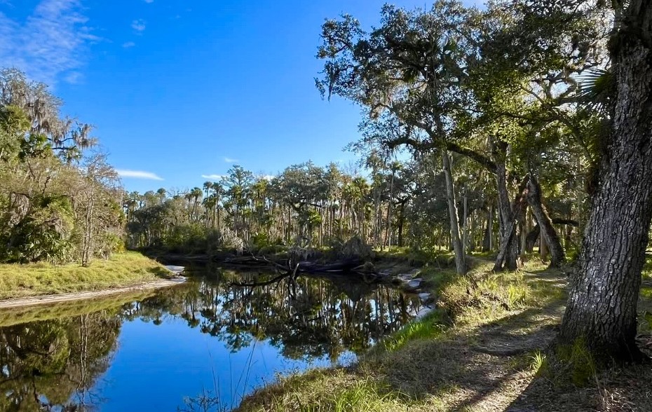 My wife and I were so smitten by the river that we chose to stop for snacks 3.8 miles into our hike, just short of the junction with the equestrian trail at a sandy beach beside the river, and we then retraced our steps to enjoy more panoramas of the Econlockhatchee. Because of the serpentine bends of the river, virtually every twist offered another pretty view of live oaks and palms arching out from the riverbanks, the sky reflecting off the glassy water’s surface, or old growth trees towering beside the trail. And although we also love the much more accessible Kolokee Loop Trail near Barr Street, this stretch is far quieter and less traveled. I’ve found few other trails so close to the Orlando metro area where you can find so much solitude while hiking beside a river.