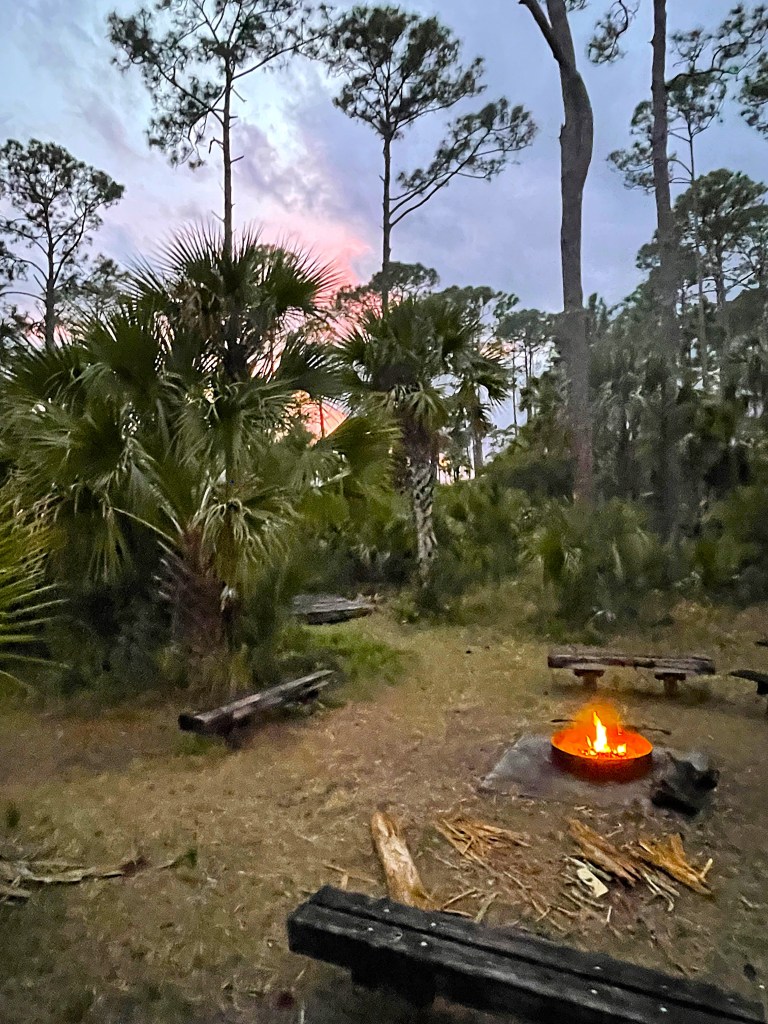 The Tiger Creek Campsite is also worth a stay. Sitting just off the Florida Trail near its southern junction with the white loop, it sits in a patch of sabal palms and slash pines and has a picnic table, benches, and even tent platforms for use during the wet seasons. It’s a great place to enjoy sunsets and sunrises, and the tent spots are also secluded enough among the palmettos for privacy if you need to share the campsite with thru hikers, as I did when I spent the night there.