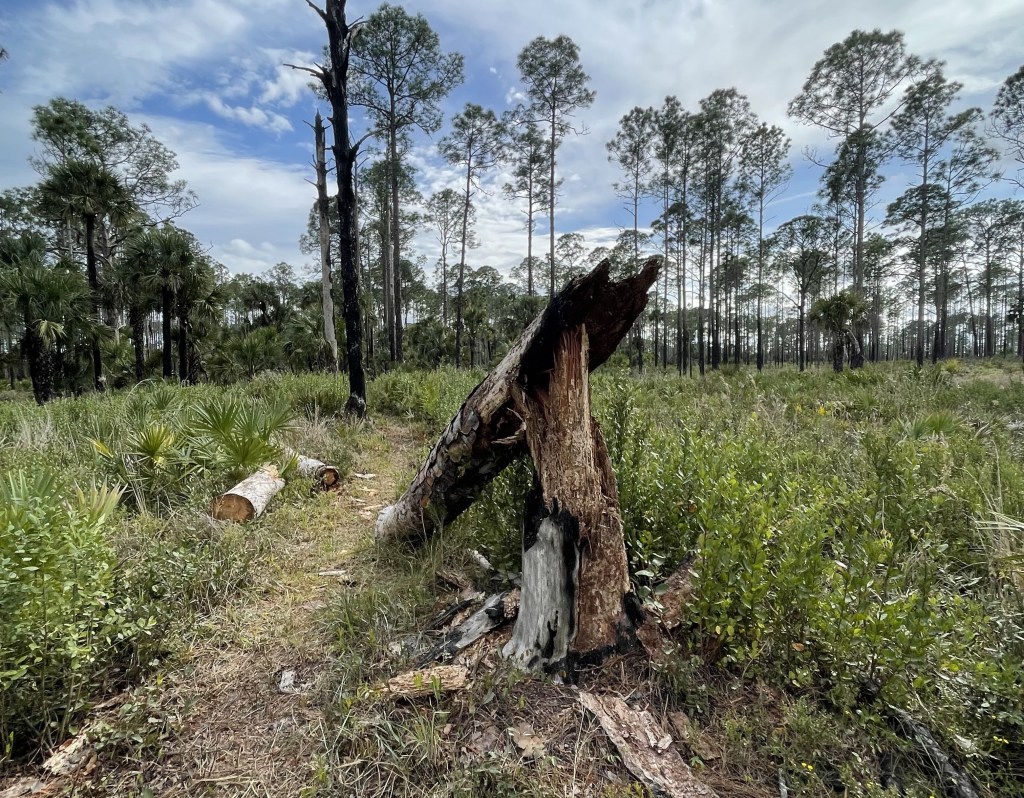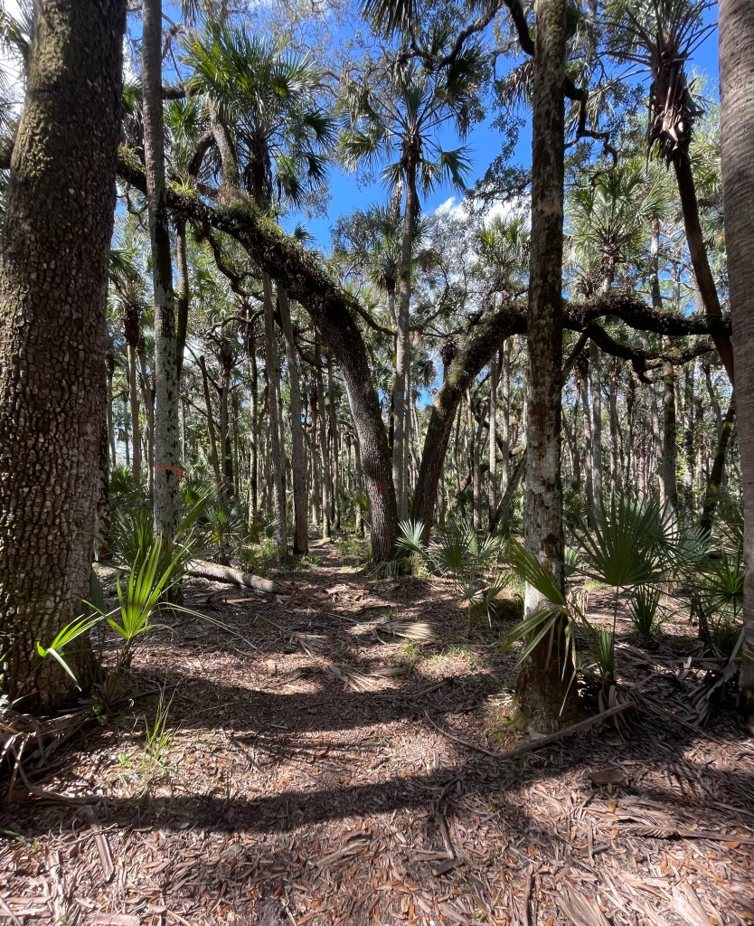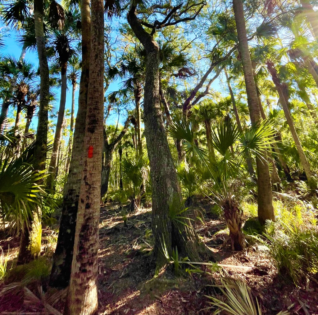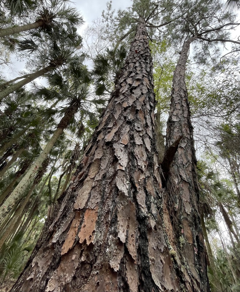 Two impressions stood out about Tosohatchee. The first is the height and size of the pines and palms. Tall, thick pines covered with shingles of bark like vertical bricks stand everywhere beside towering pines of similar height, particularly along the abandoned railroad bed in the flatwoods in the white trail and the drier western segments of the Florida Trail.