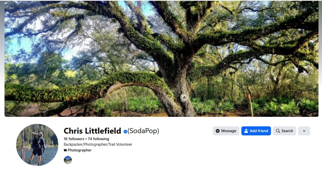 He is also one heck of a photographer. Just check out his Facebook page (https://www.facebook.com/chris.littlefield.35) and you’ll see what I mean. He’s so highly regarded by the Florida Trail Association that he’s been tapped to be the photographer for Florida Trail Fest, FTA’s weeklong celebration of the outdoors at Stephen Foster Folk Culture State Park from March 6th through 8th, and FTA also put a photo he took of the Osceola National Forest on the front panel of its newest hat. Chris also posts informative and entertaining videos of his adventures on his YouTube channel, SodaPopHiker.