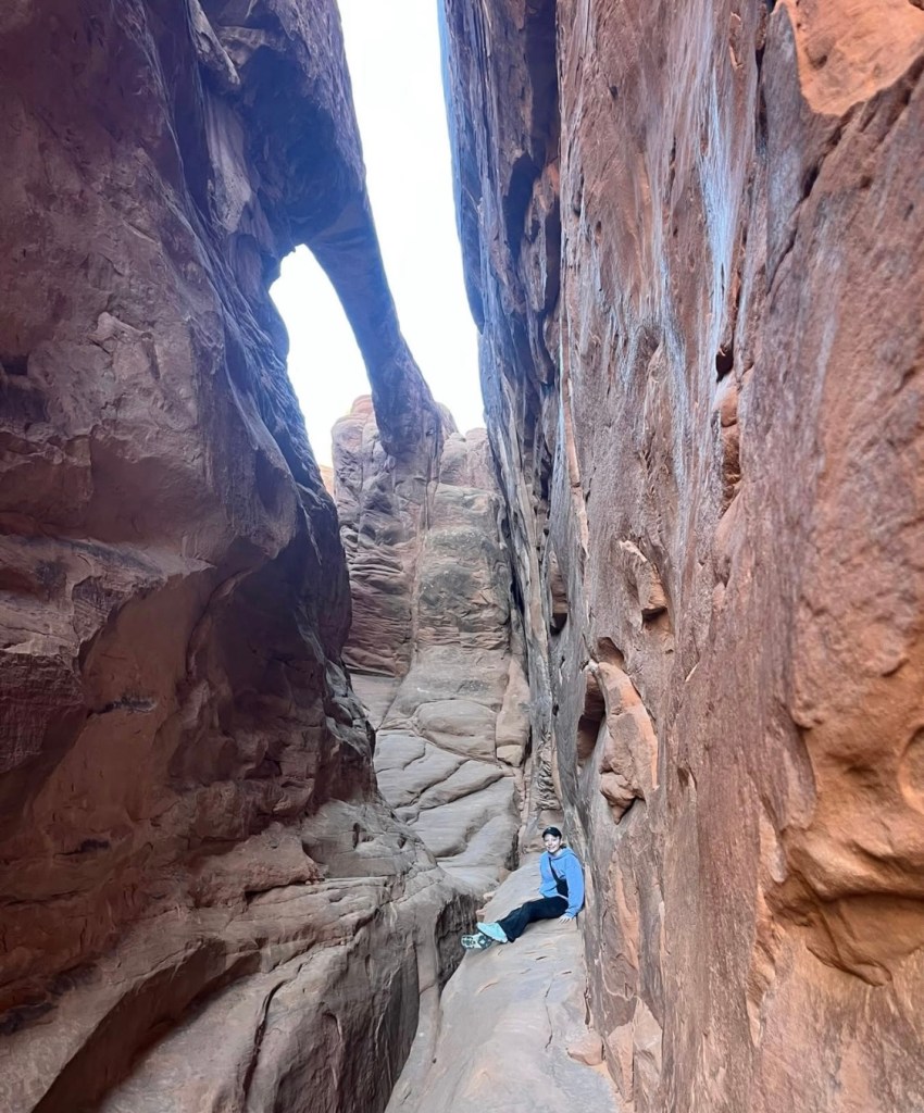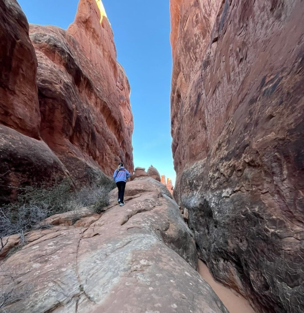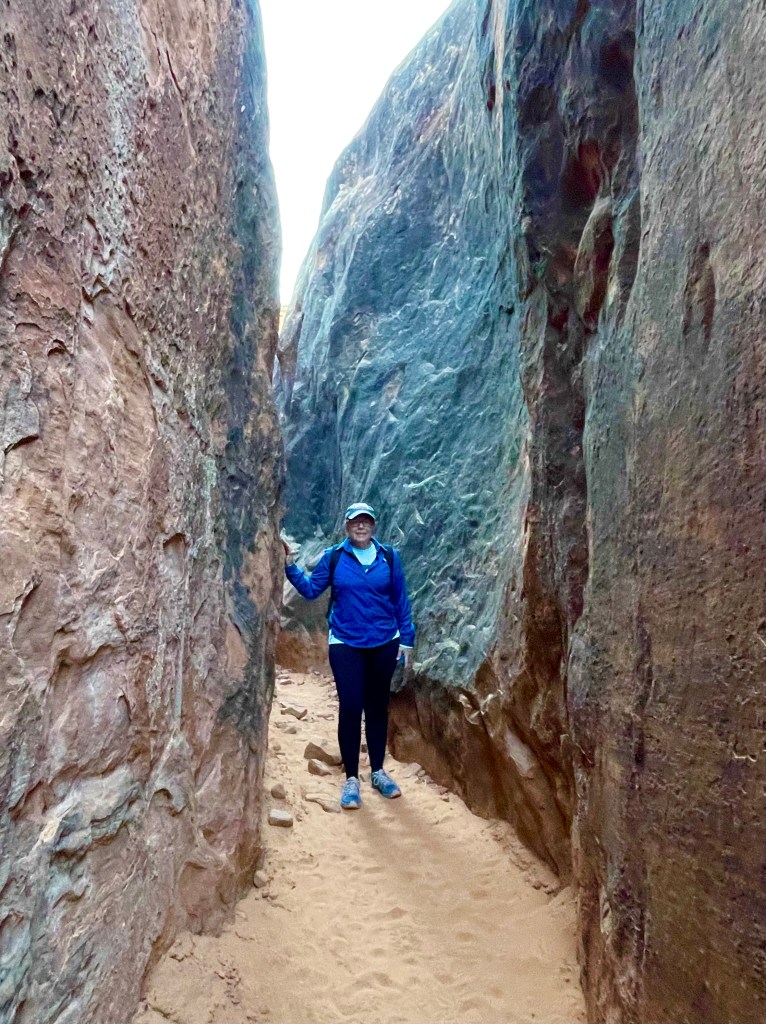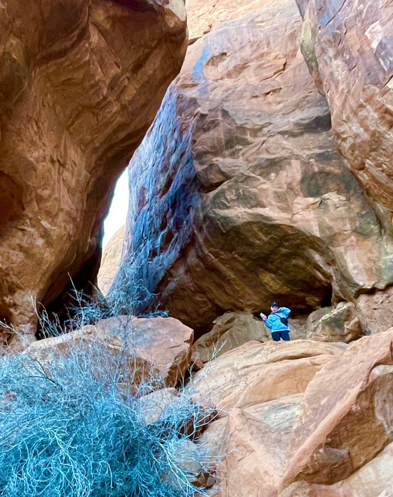 Arches National Park warns for good reason that the Fiery Furnace can be challenging and physically demanding, as many portions require you to climb steep rock faces, squeeze or lift yourself through narrow passages, and even jump or climb across crevasses (although none of those gaps lie directly above deep drops). But with that said, you don’t have to be an experienced rock climber to enjoy the Fiery Furnace. My fourteen-year-old had no problem getting through (even if she had to be coaxed through several sketchy passages), nor did I, despite being an embarrassingly out-of-shape 50-year-old with a crippling fear of heights.